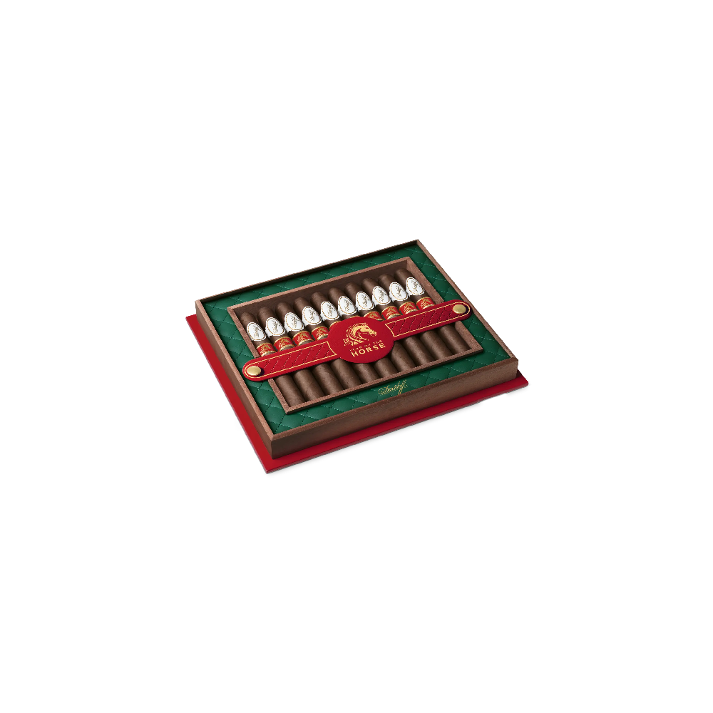Die Davidoff Year of the Horse – Limited Edition 2026 ist eine exklusive Premiumzigarre, die die Stärke und Eleganz des Pferdes würdigt. Im neuen Toro-Especial-Format (55 × 6½) von erfahrenen Davidoff-Torcedores von Hand gerollt, präsentiert sie einen außergewöhnlichen Blend aus sechs firmeneigenen Hybridsamen, darunter seltene dominikanische Vintage-Tabake mit einem Gesamtalter von 43 Jahren. Das ecuadorianische Deck- und Umblatt sowie die dominikanische Einlage ergeben ein mittel- bis vollmundiges Aromenspiel aus süßer Creme, Milchschokolade und gerösteten Haselnüssen, begleitet von holzigen, ledrigen und pfeffrigen Nuancen im späteren Verlauf.