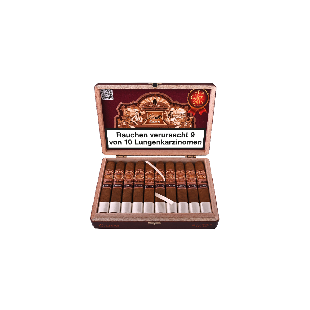 Seit Ernesto 2009 zusammen mit seinen Kindern »EPC Cigar Co.« gegründet hat, haben viele Spitzenzigarren die »Tabacalera La Alianza« in der Dominikanischen Republik verlassen. Unter anderen die »La Historia « , die 2014 auf Platz 2 der Bestenliste vom Cigar Aficionado gewählt wurde. Vier Jahre später nun der erste Platz und das mit dem ersten nicaraguanischen Puro, den EPC Cigar je hervorgebracht hat . Wer den rose - goldenen Zigarrenring der » Encore « genauer betrachtet, wird feststellen, dass die » La Historia « einen ähnlichen trägt, nur die Farben unterscheiden sich. Wie der Name » Encore « bereits suggeriert, stellt sie die Zugabe zur » La Historia « dar. Die » Encore « sollte die Aficionados weltweit schon im Jahre 2016 begeistern, jedoch wollte Ernesto den Deckblättern noch ein wenig mehr Zeit geben. Er folgte seinem einmaligen Instinkt für Tabak und gab den Deckblättern noch ganze zwei Jahre mehr Zeit zum Reifen! Diese Entscheidung wurde vom »Cigar Aficionado« mit einem phänomenalen Rating von 96 belohnt! Jahrzehntelanges Wissen kombiniert mit unzähligen Stunden der Sorgfalt und Aufmerksamkeit haben die » Encore « geschaffen – ein Zigarrenerlebnis dass einzigartig ist und welches Sie immer wieder wiederholen möchten . Also berauschen Sie sich an dieser herausragenden Zigarre und genießen Sie diese - vielleicht zusammen mit einem Latte Macchiato, so wie es Ernestos Tochter Lissette Perez Carrillo am liebsten tut!
